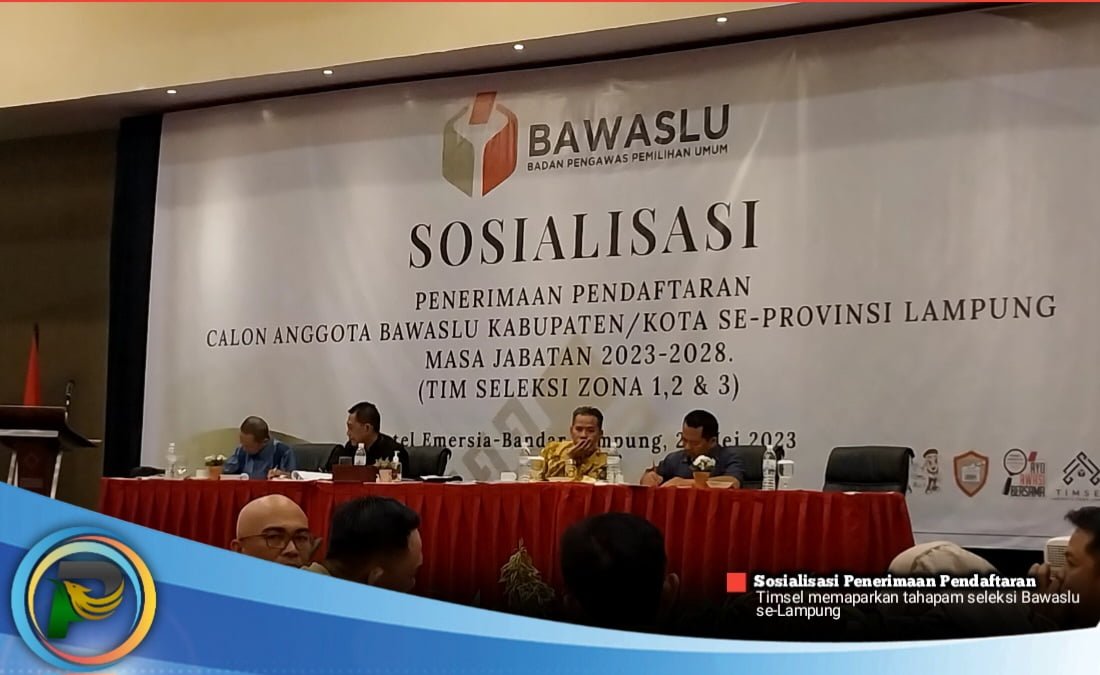 psiaceh.or.id/ – Tim seleksi Bawaslu Kabupaten/Kota se Lampung mensosialisasikan tahapan seleksi Badan Pengawas Pemilu (Bawaslu) 15 kabupaten/kota di Ballroom Emercia Hotel, Sabtu (27/05/2023).